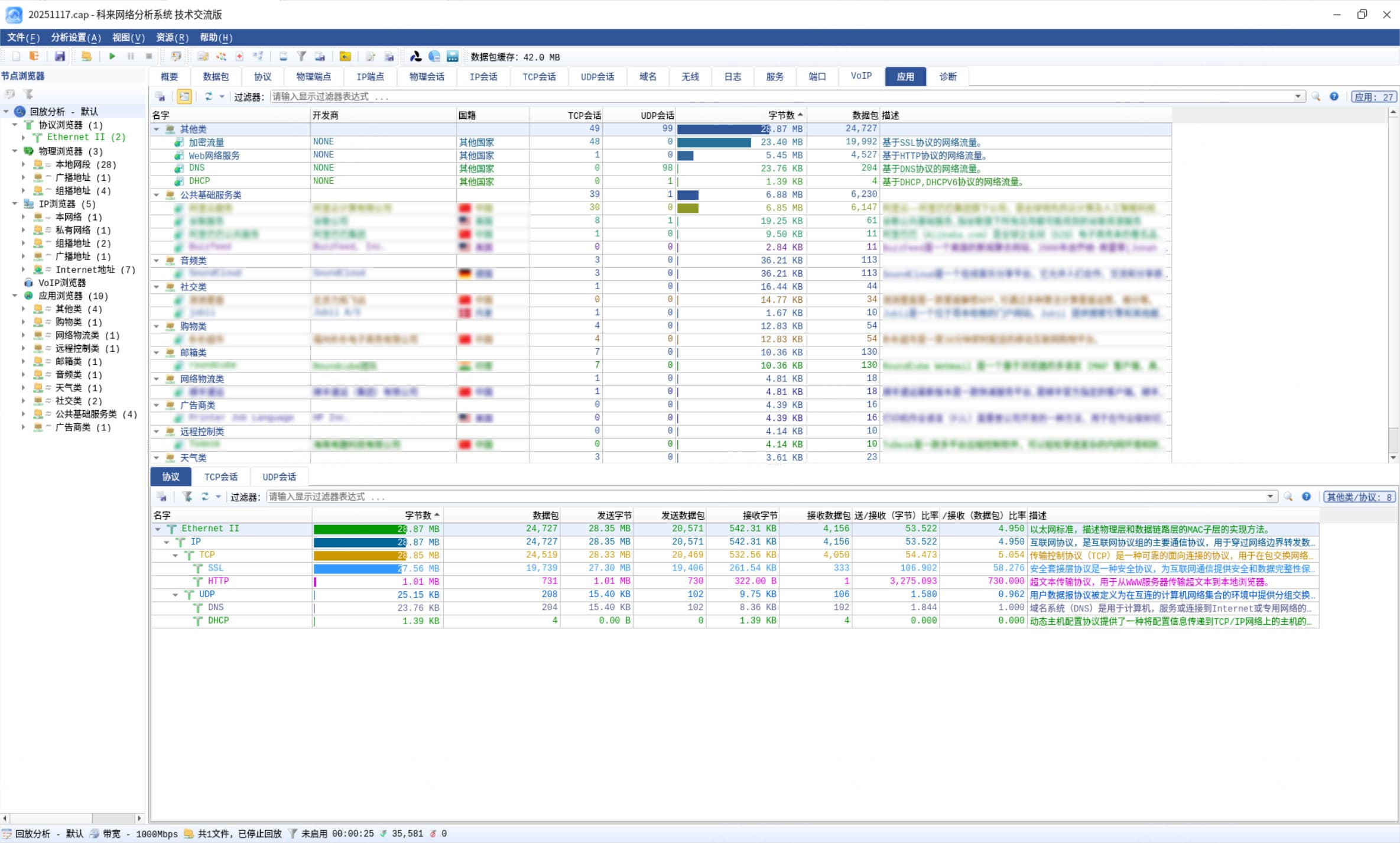 系統支持對多類網絡應用協議實時解碼,以協議樹形式全景展現數據包信息,可提供數據包中、英文雙語解碼。